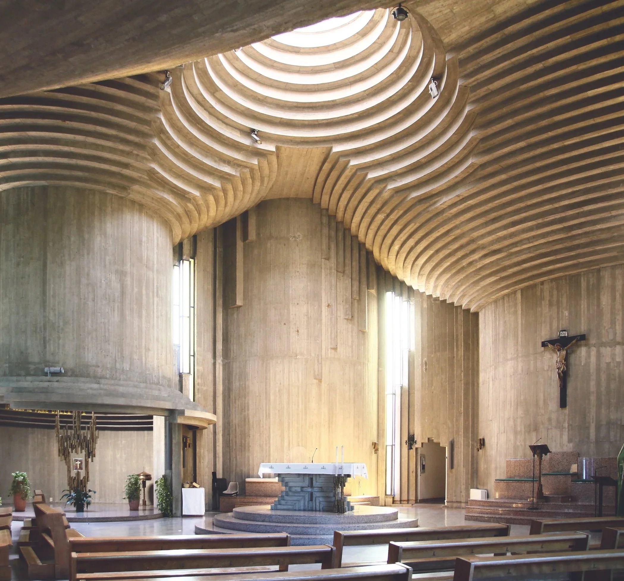 This church was designed in 1969 by architect Paolo Portoghesi and engineer Vittorio Gigliotti for the city of Salerno. It is one of the few examples of modern churches whose design is based on the principles of the Second Vatican Council. At the same time, its design contains a number of references both to the history of architecture, particularly Borromini’s Sant’Ivo alla Sapienza in Rome, and the world of natural and organic shapes.